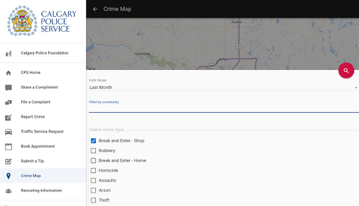 • Crime map enabling users to search 12 categories of crime in your community, including arson, assault, attempted murder, break and enter (2 types), vandalism, robbery, sexual offences, theft (3 types), and homicide.