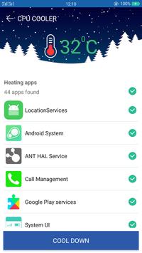 Just click “Cool Down” Botton to detect & close overheating apps to reduce CPU usage and Cool down your device.
