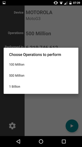 Select from 100 million, 500 million and 1 billion operations for your devices CPU to perform and get the results in nanoseconds and milliseconds.