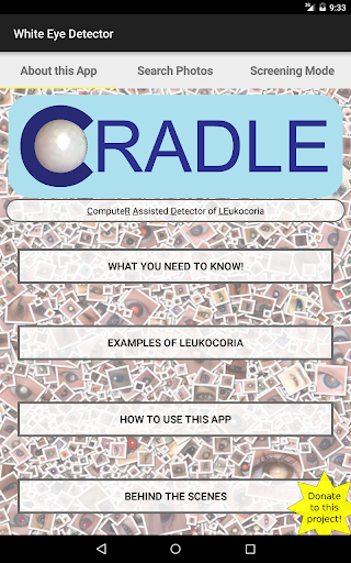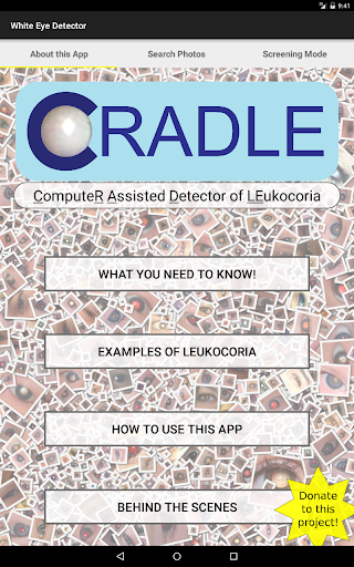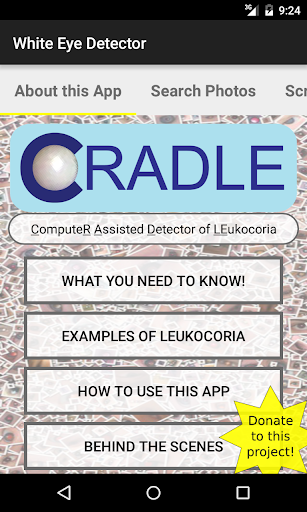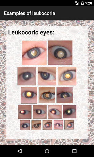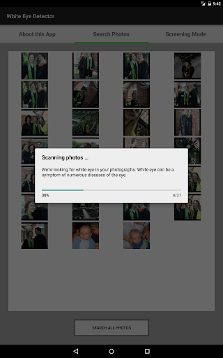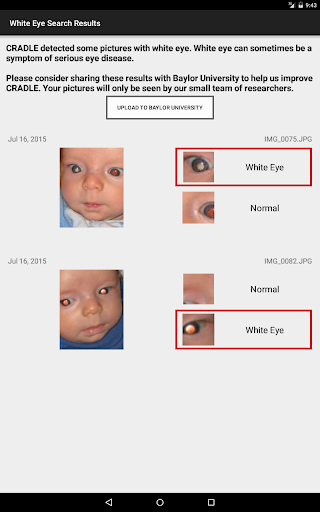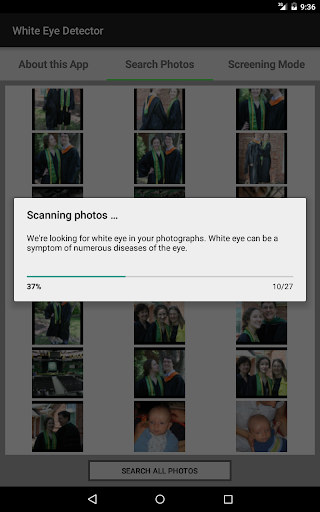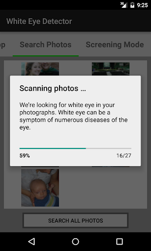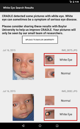 The White Eye Detector app helps parents detect the appearance of white eye in pictures of their children. A white pupil can be a normal photographic effect in pictures (like red eye, but white). White eye can also be a symptom of multiple serious eye diseases such as retinoblastoma, pediatric cataract, and Coats' disease. These diseases are often first detected by parents because the parent notices white eye in pictures of their children. This app will find pictures on your phone or tablet that have white eye, and will show you these pictures so that you can inspect them for yourself.