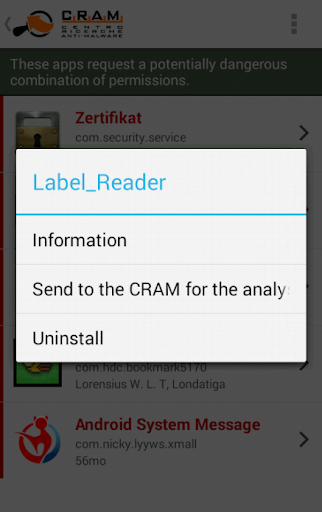 CRAM App Analyser is a "privacy advisor", which allows you to check the apps that may represent potential issues to YOUR security and to YOUR privacy.