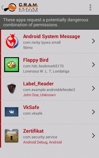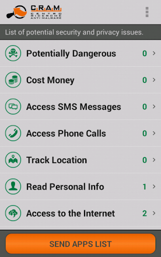 Clicking on any of the mentioned items, the list of affected apps will be shown (in red if suspicious or potentially dangerous).