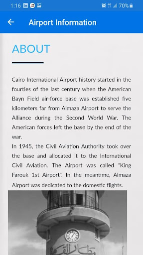 The application includes many services available at Cairo International Airport, such as Ahlan Service Reservation, also includes details of all terminal buildings, airlines, tourism offices, and services provided by the Cairo Airport Company