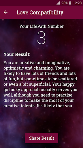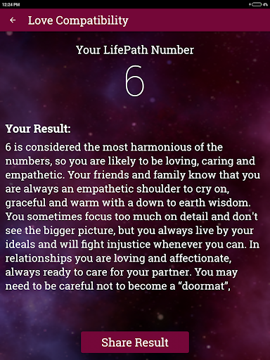 For Numerology, the app calculates your life path number based on your birth date. Find out your personality traits based on your life path number.