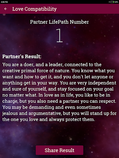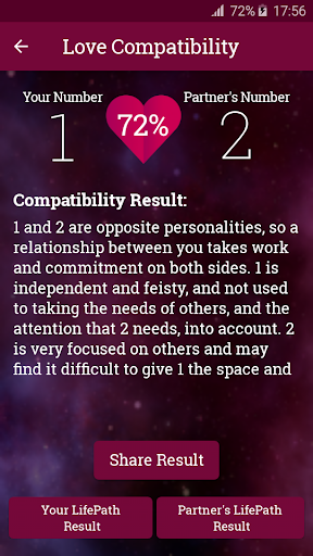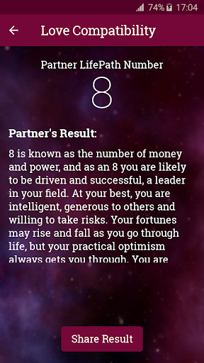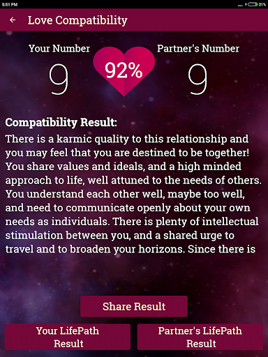 Basically, life path number refers to what/how you appear in the eyes of others physically as well as mentally. With this app you can get to know the life path result of you as well as your partner.