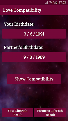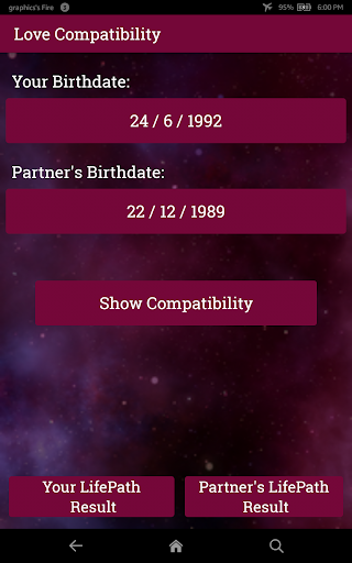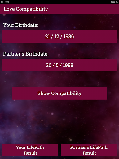 Are you and your partner a good match? Are you really right for each other? Is there a special connection between you? Is your partner really your soul mate? Get your questions answered using this Love compatibility app. The answers are based on Numerology. This app lets you calculate your love compatibility percentage and tells you about your chances of a successful long-term relationship. You won't have to wait for months or even years to get to know whether you are a perfect match or not! Just enter your birth date and your partner's birth date and in a few seconds you will find out where your relationship stands. This Numerology Love Calculator compares your Birthday with your partner's Birthday to tell you how compatible are you with your partner.