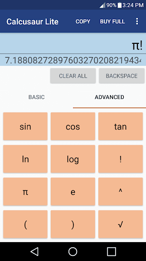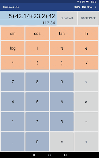 • Extra calculator buttons: sin, cos, tan, ln, log, π, e, !, ^, √, and ()
