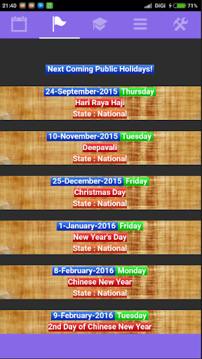 - Show upcoming Singapore and School Public Holidays.