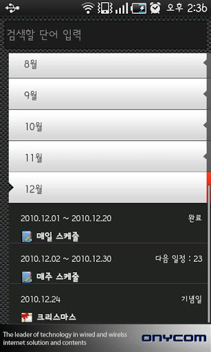 Application UsageHome screen idle screen Press and hold gt; widget selection gt; Calendar Widget, select Calendar Widget Simply and useful Calendar widget. It39;s showing 8 weeks at widget. You can managing schedule and annivarsary. You can change clock from calendar. You can check schedule list of year at a glance. Support alarm. If someone promises preregistration, when the alarm went off that can connect directly Sync with google calendarOnly for Calendar widget. QVGA 240x320 screen, it does not support.BLOG http:onycom.tistory.comTags : Calendar, Widget, Schedule, Anniversary, Clock, Birthday, Alarm, , , , , , , , , , , , ONYCOM, onycom,