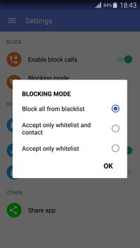 Blocking mode: Block all from blacklist, Block all new numbers except contacts, Accept all.