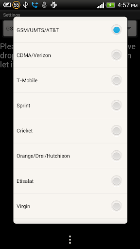 Previously this app was supporting only GSM/UMTS networks but now it has included support for Verizon, Sprint, Virgin, Etisalat and T-Mobile networks also. When you start the app, from 'options menu' button of your phone, go to settings (if you do not know what is 'options menu' then please see screenshot). In Settings, you will see a drop-down which prompts to select the network. According to your selected network, it will perform the forwarding of calls.