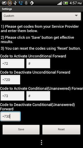 This drop-down has a 12th option a 'Custom'. If your network is not from first nine options then you can use 12th option i.e 'Custom'. On selecting custom, six text inputs and two buttons will be visible. In six text inputs, you have to enter call forward codes. These codes you have to obtain from your service providers. After entering all six codes click on the save button to save them. Once saved you can then forward your calls :).