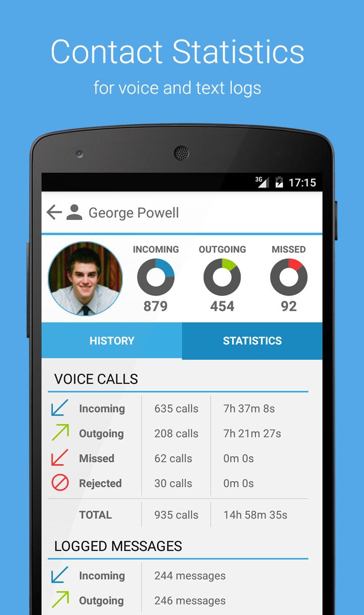 - Apply filters by entry type (voice call / text message), date interval or call direction