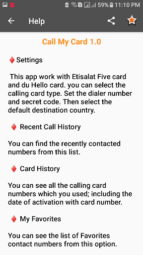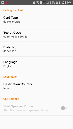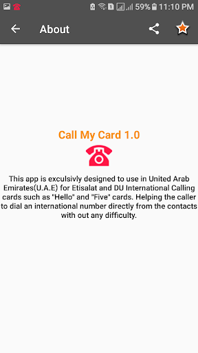 This app is exclusively designed to use in United Arab Emirates(U.A.E) for Etisalat and DU International Calling cards such as "Hello" and "Five" cards. Helping the caller to dial an international number directly from the contacts with out any difficulty.