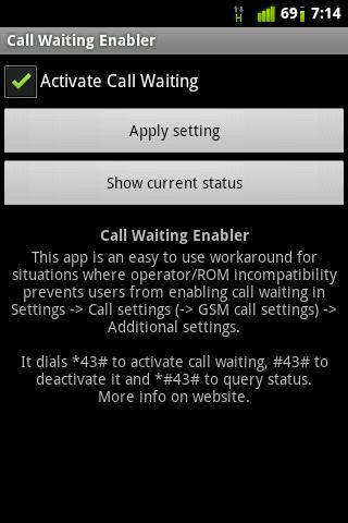 This app is an easy to use workaround for situations where operator/ROM incompatibility prevents users from activating call waiting (ability to receive calls while in call) in Settings -> Call settings (-> GSM call settings) -> Additional settings.