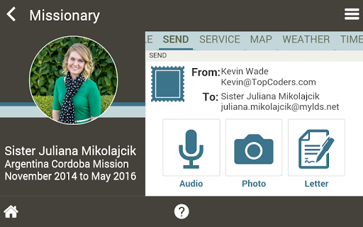 - Send pictures, emails and audio recordings directly from the app to any missionary.