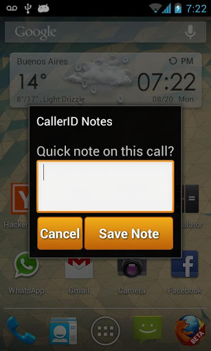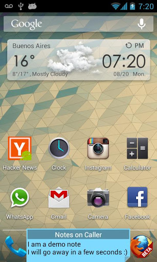 LIMITED TIME OFFER: PRO VERSION ONLY 0.99Add Postits to your contacts and have them show up when they callUse it for taking down personal notes or reminders, and avoid an awkward moment of not knowing where you know that person from Got some pending tasks on someone? Add a quick note as you39;ll be reminded of it when they call you.To see the true potential of this app, add a few notes and just wait until those people call you. Now imagine being able to do that for each and everyone of your contacts. NEW: This is a LITE Version This Lite version is offered as a way to try out the app before buying it. It comes with a few restrictions:1. A maximum of 5 notes allowed2. A maximum of 1 note per contact3. Cannot choose from different note styles. If you like this App, get the Full version with no restrictions Caller ID Notes PRO.There are a few apps that try to do the same but this one is unique in its own sense: You choose the information to be display add, remove and edit them as you wish The notes are beautifully designed to look like a Postit. The notes are not displayed on top of the details of the caller. The notes only take up the bare minimum space needed to show them. As soon as you take the call or cancel it, the notes disappear from the screen. It is completely unobtrusive. It DOES NOT waste any extra battery life. You can even close the app and the notes will still show up. How to use this App This is the easiest way to start using the app1. Open the app2. Click on quot;Add Notequot; button and choose a contact from your contact list3. Write your note or reminder and you39;re done.4. Relax, close the app if you want, and forget about it Next time that person calls, that note will pop up alongside the caller id screen.If you like the app, please rate us And if you think there39;s something missing from the app, remember to send us an email