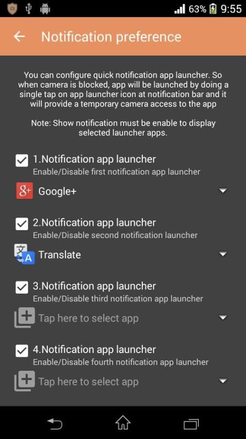 Notification app launcher for temporary camera access to selected app.