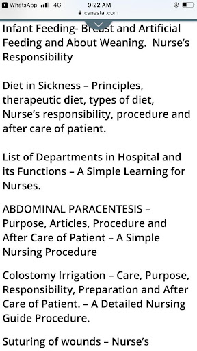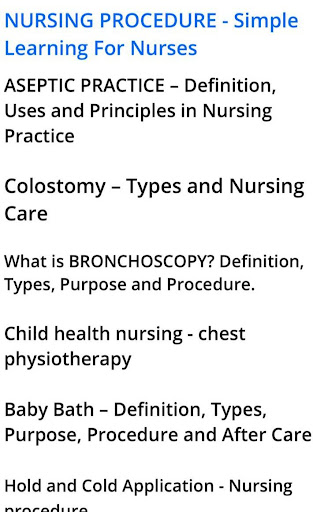 (Aseptic Practice, Colostomy, Bronchoscopy, Chest Physiotherapy, Baby Bath, Hold and Cold Application, Hygiene, Bed sore or Pressure points, Patient Positioning in Bed, Hospital Admission Procedure, Comfort Devices, Nursing Documentation and Reporting, Catheterization, Perineal Care, Nursing Process, Specimen Collection, Administration of Injection, Nursing Theories, Wound Care, E.C.G, E.E.G, E.M.G, Endotracheal intubation, Gastric lavage, venesection or Cut down, Instillation, Storing of Medicines, Inhalation, Hospital Housekeeping, Tube Feeding (Gastric Gavage), Coughing Technique, Gastro intestinal decompression, Vaginal Irrigation, Cardio Pulmonary Resuscitation (CPR), Laryngoscopy, Bronchoscopy, Oesophago-gastro-duodenoscopy, Colonic Irrigation, Infant Feeding, Diet in Sickness, List of Departments in Hospital, Abdominal Paracentesis, Abdominal Distension, Treatment of colon, Physical Examination, Vital Signs, Oxygen Administration, Wound Drains, Bandages and Binders, Wound Dressing, Lumbar Puncture etc.