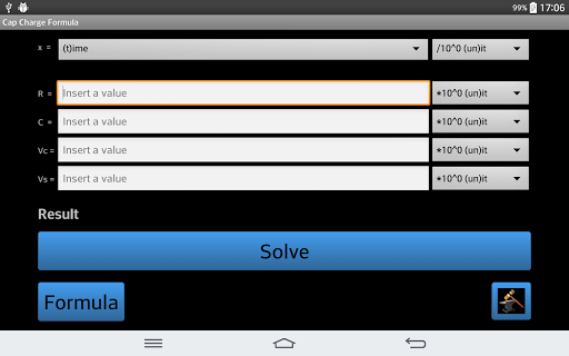 } and there is the possibility to insert or to get the solution in different scale units (such as milli, Kilo etc.). Also, it includes a PDF file with the proof of the formula that is used for the calculations in the app. Finally, If you find a bug or you want to suggest a feature send me an email at: iron.electronics@gmail.com