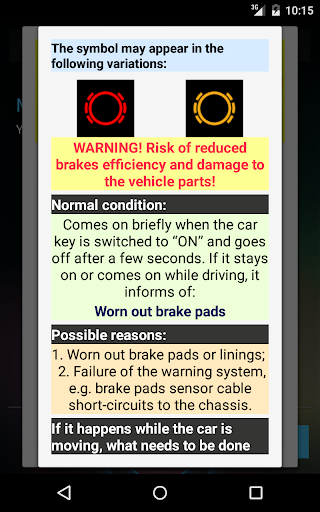 Whenever a visit to a repair shop is recommended, it is usually the best solution. Although these recommendations are a result of many years of experience, they are only intended to give you advice and any action you take is at your own risk and responsibility. The appearance of actual symbols, as well as their meanings, may differ from the representations in this application. The creators of this application cannot be held responsible for any damage caused on individuals or objects. Do not use the application while driving.