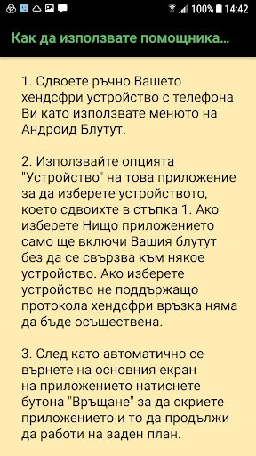 The application monitors the activity of the user and when moving in a vehicle connects to the car hands free system. After exiting the car the application automatically disconnects and switches bluetooth off.