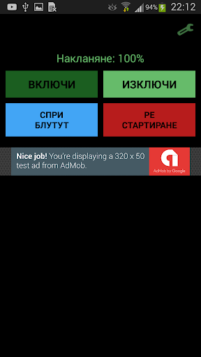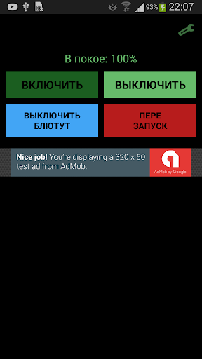 The main screen has 4 buttons: start, stop, turn bluetooth off, and restart.