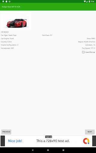 Ad supported. Uses the internet permission to display ads. Uses the file permission to import and export your owned cars list.