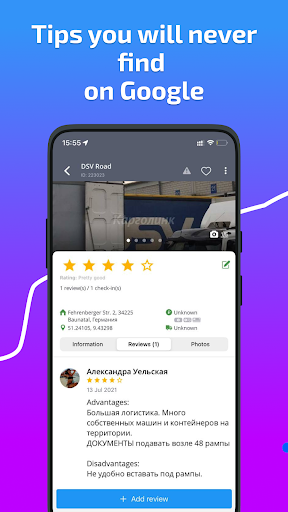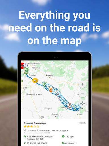Truckers themselves provide information about free parking spaces, inexpensive cafés for lunch through reviews.