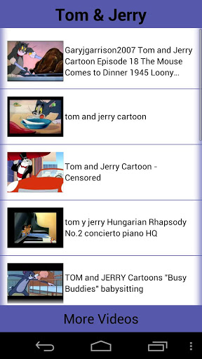 Ver 6.0 is out Added three Classic cartoons with this version.. Betty Boop Mighty Mouse Woody Woodpecker Almost all Bugs fixed Enjoy the App More than 100000 best youtube Videos of the funniest and most loved cartoon characters in history.Featuring... Chip and Dale Duck Tales The Mask Mickey Mouse Donald Duck Tom amp; Jerry Looney Tunes Oggy amp; Cockroaches Kid vs Cat Popeye Timon amp; Pumba Goofyand more....quot;BEST APPLICATION FOR YOUR KIDSquot;Please rate the app if u like it...Please do drop comments to make the app more amp; more successful :Also do suggest new cartoon characters which you will like to feature in next update :DISCLAIMER : The content of this app are powered by YOUTUBE. This app just provides links to access the videos in an organized way and we are not responsible for any copyright issues as the app gives access to YOUTUBE videos AVAILABLE ON PUBLIC DOMAIN as is. For more videos please visit http:m.youtube.comquot;gt;youtube