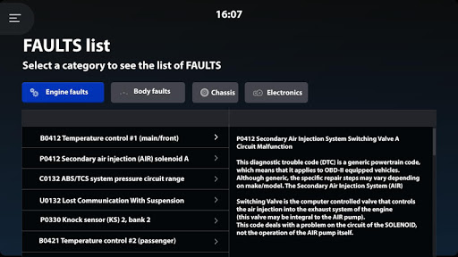 Carzis read and give a description of check engine trouble codes like engine, body system, chassis and electrical equipment with first letter P--/U--/B--/C---and get complete information from your vehicle's sensors.