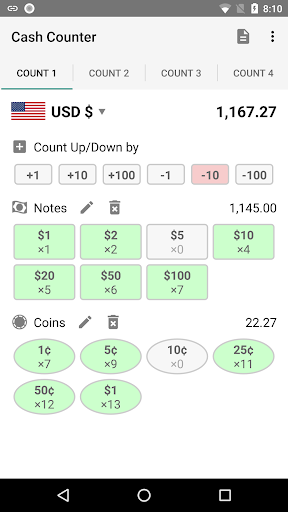 Easily switch between multiple active counts, even if they are of different currencies. So you could be using it as a dollar counter , an euro counter as well as a rupee counter at the same time! Tally cash receipts without errors. Can be used in small shops as a virtual cash register.