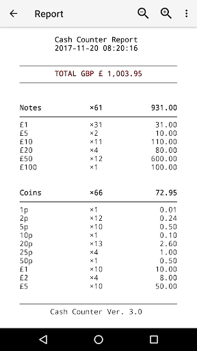 Generate a nice report at the end of cash counting and easily share or archive via mail or print it.