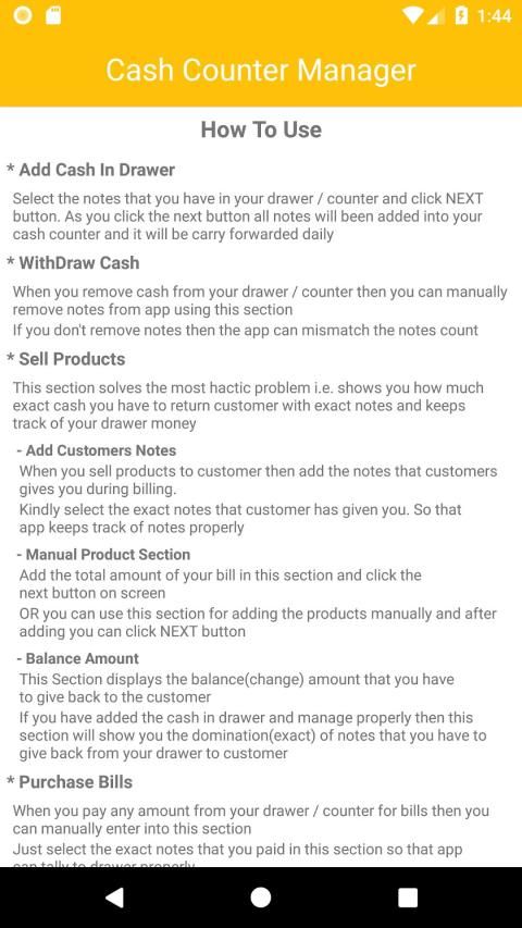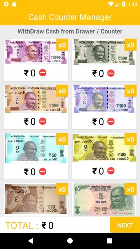 This Smart App helps you keep track of your daily cash transactions with exact domination of notes. Just enter note denominations and let this app take care of the rest.