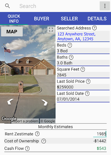 From there you can customize the Estimated Information to help you make your investment decision quickly. Cash Flow Calculator also allows you to see the Google Map View or Street View of the subject Property to take a quick look around the neighborhood.