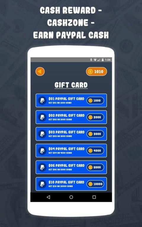 You can earn Paypal Cash & Free Gift Cards anytime and from anywhere. Cash Reward - Cashzone - Earn Paypal Cash application is quick and fun way to make easy money!