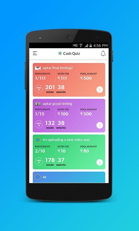 This application provides a healthy platform where user can register himself/herself with his/her correct details as demanded. After registration, user can choose any quiz of his/her interest and enter and play in the quiz after paying the assigned fee. Each quiz will carry certain number of question which are to be answered by user. After answering all the questions, the performance of the user will be stored. As the quiz will be over after fixed time or the number of participants which can play the quiz have reached the maximum, the leadership board will be decided on the basis of more number of questions answered correctly and time taken to answer them. It means, the user with largest number of correct answers and shortest duration of time taken to answer the questions will be more likely to win. The winners according to their rank will get their winning amount (mentioned in the quiz) in their Paytm wallets within 4 working days.