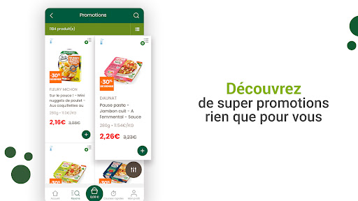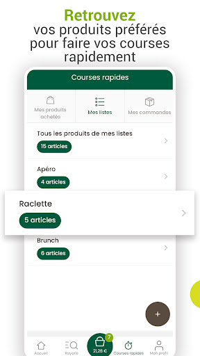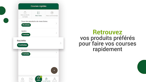Que vous fassiez vos courses tous les jours ou chaque semaine, vous n'êtes pas à l'abri d'un oubli ! Grâce à la fonctionnalité "courses rapides", créez autant de listes de courses que vous le souhaitez ! Vous pouvez également retrouver vos produits achetés en 1 clic et les ajouter à vos listes de courses. Apéro, brunch, soirée entre amis, recettes ou repas du quotidien... Organisez efficacement et rapidement vos courses.