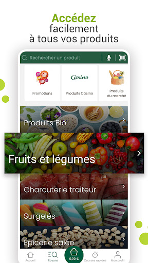 Retrouvez à portée de main tous les rayons de votre magasin Casino : produits Bio, fruits et légumes, viandes et poissons, pains et pâtisserie, produits laitiers, charcuterie traiteur, surgelés, épicerie salée, épicerie sucrée, boissons, vins et champagnes, univers du bébé, hygiène et beauté, entretien nettoyage, animaux, maison et loisirs.