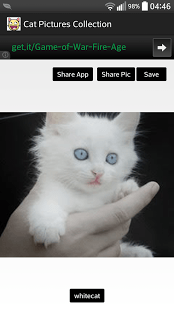 This application contains few cat pictures categorized based on its activities. We will update the pictures regularly. You don’t need to download the application again for new pictures.
