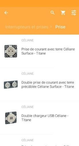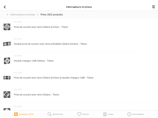 - Par désignation (vue hiérarchique de la classification des produits), comme « Interrupteurs et prises », « Tableaux électriques et disjoncteurs », « Multimédia » ou encore « Sonnettes, portiers et éclairage ».