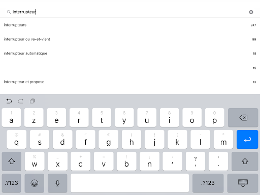- Par mot(s) clé(s), comme interrupteurs, prises, objets connectés, normes, plaques de couleur, tableaux électriques…etc.