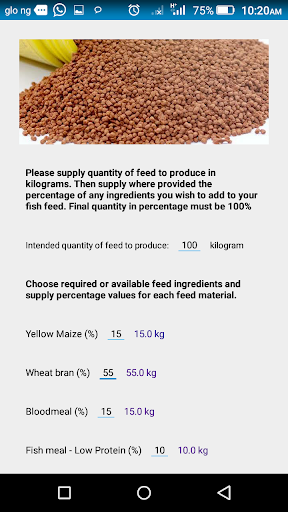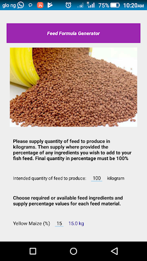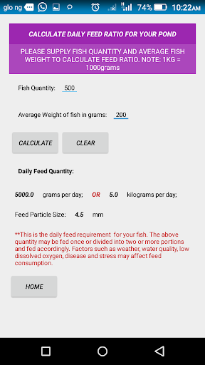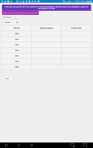 Have you ever wondered how much feed needed to grow your fish to maturity? This app will help you calculate the exact amount of every feed size needed to grow any given quantity of fish up till table size. You may choose to buy all the feed in bulk or buy specific quantities of each in batches and switch to bigger sizes as you exhaust the smaller ones. It solves the challenge of not knowing when to change feed size for your fish.