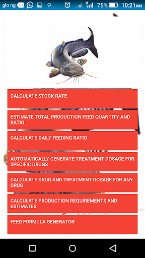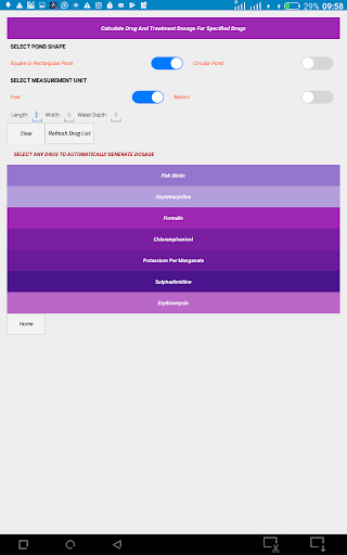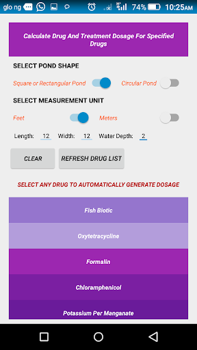 This app solves the problem often faced by new and old farmers in knowing the exact volume of water contained in any given fish pond and the optimum amount of fish to be stocked for best results. It also guides farmers on drug administration and measurements for catfish drugs. You no longer have to work blindly or struggle to determine the required drug dosage for treating your fish effectively.