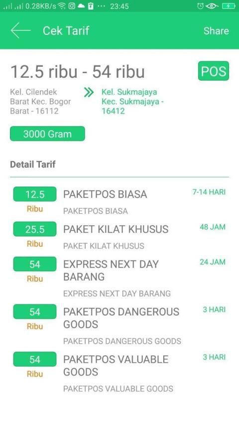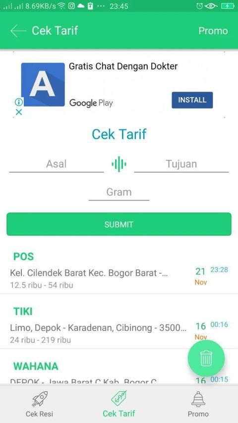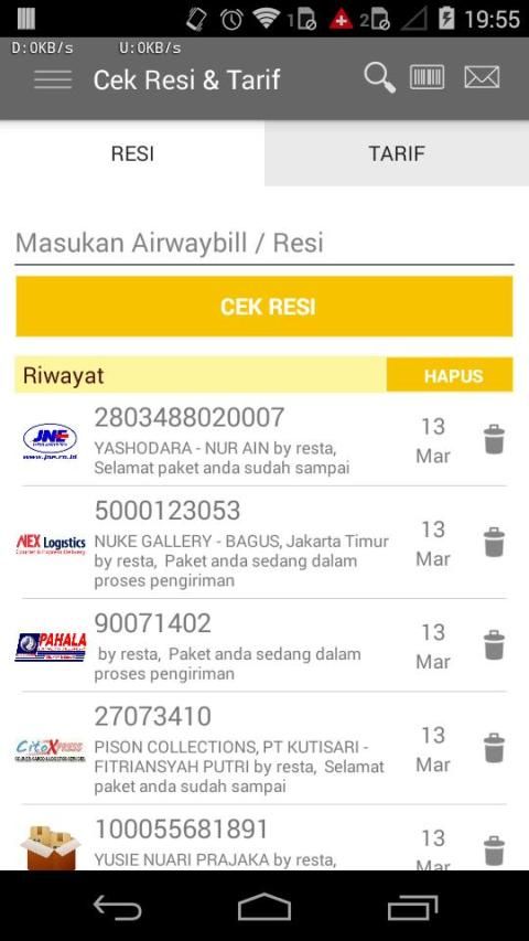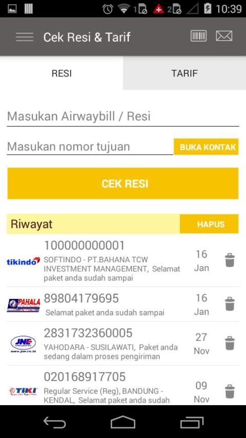 Aplikasi ini menggabungkan kemampuan tracking nomor resi dan pengecekan biaya ongkos kirim berbagai ekspedisi pengiriman.