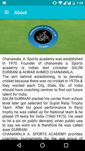 Chanawala .A. Sports academy was established in 1970. Founder of chanawala a. Sports academy is indian test cricketer SALIM DURRANI & AHRAR AHMED CHANAWALA.