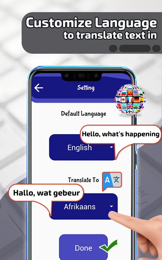 Just type text and tap translate button and select your desired language from settings. Now you don’t need to copy and paste text for translation. Just use this simple with awesome Text translator keyboard for chatting with friends of different language speakers. You can talk to people of all different countries by this keyboard translator application.