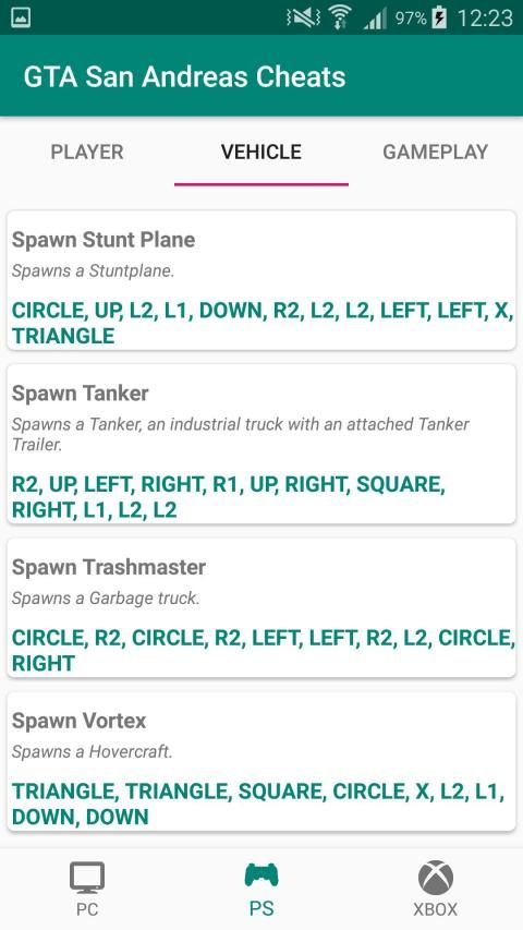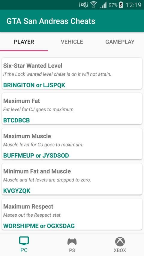 Cheat codes for GTA San Andreas are listed with guides. PC, Xbox, and Play Station versions are all included.