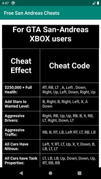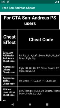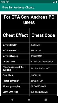 This free Unofficial app for cheat codes of gta San Andreas game is small in size and contain all important cheat codes for gta San Andreas game in pc, ps, xbox. Cheats for gta San Andreas in PC.