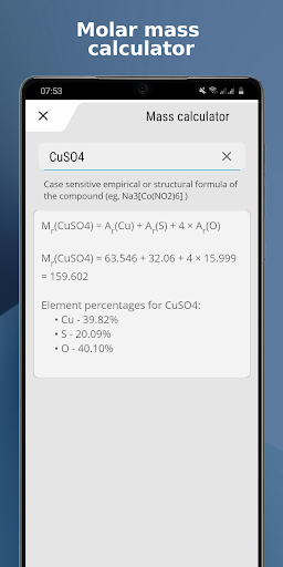 Simple calculator of molar/molecular mass of a compound, including the percentage of the mass of elements.